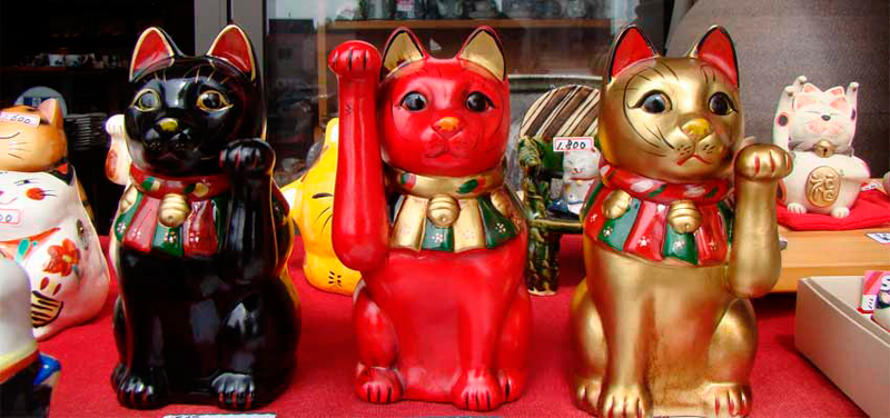 Probablemente, uno de los amuletos más conocidos fuera de las fronteras niponas. Su nombre significa, literalmente, “el gato que invita a entrar,” el maneki neko es un gato por lo común sentado sobre un cojín con la patita levantada (como si nos estuviera llamando) y una moneda en la otra. Sobre su cuello, cuelga un cascabel.
