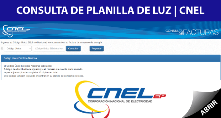 Como consultar planillas CNEL CNEL es la empresa encargada del servicio de energía eléctrica en el Ecuador. CNEL brinda a sus clientes la facilidad de consultar sus planillas mediante una página web, que está a disposición del pueblo ecuatoriano las 24 horas Como consultar planillas CNEL En primer lugar debes dirígete a tu navegador e … Leer más